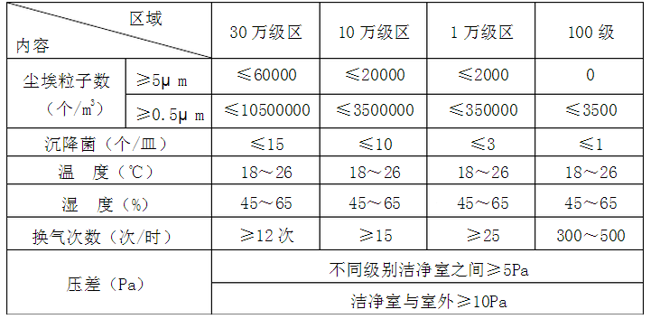 表1 潔凈區環境控制標準