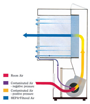 在一個水平層流潔凈工作臺,室內(nèi)空氣通過送風機/電動機吸入到機罩的基礎(chǔ)上,通過一可清洗,可重復使用的預過濾器。引擎蓋通過HEPA過濾器的空氣推高后全會。過濾的空氣在100 FPM朝向用戶的等速橫過工作表面水平地定向。